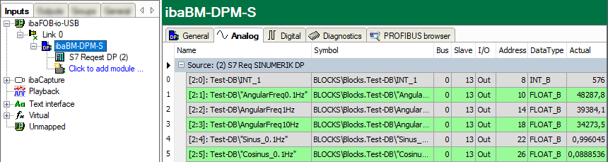 When you select the bus module node in the signal tree and choose the Analog or Digital tab, you get a list of all operands that are acquired in the bus module with data type and actual value.
