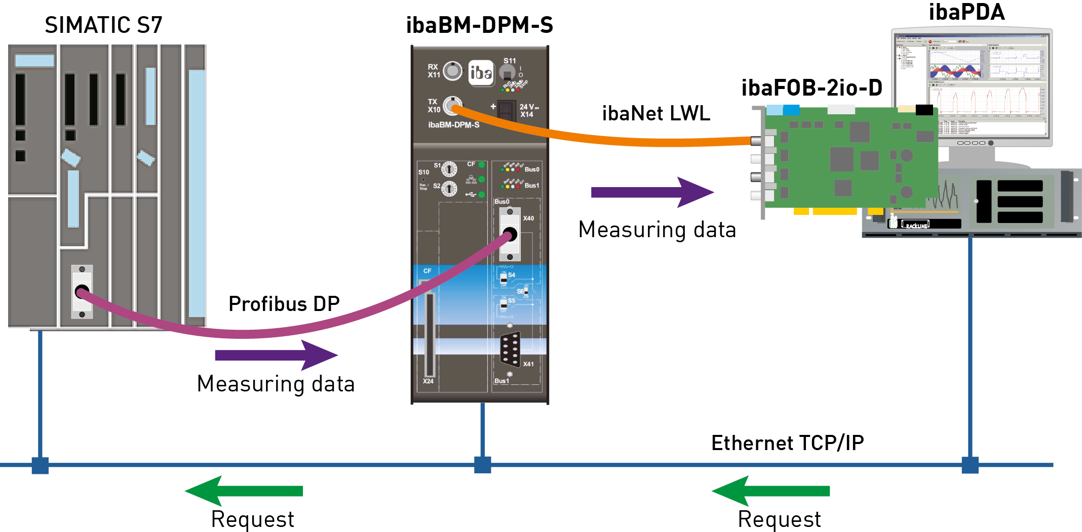 The following illustration shows the configuration using a TCP/IP online connection between ibaPDA and S7-CPU.
