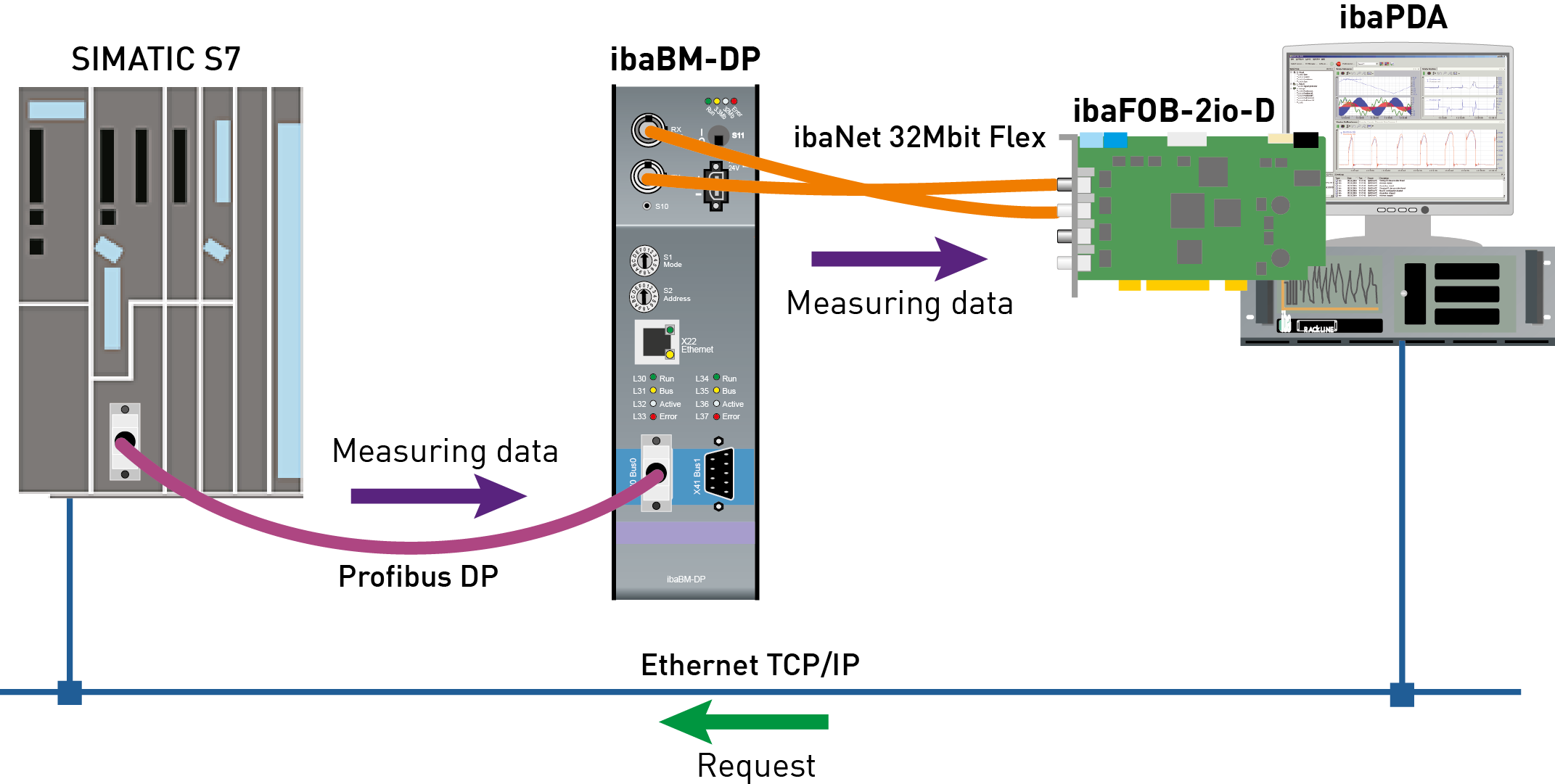 A connection from ibaBM-DP to the network (TCP/IP over Ethernet) is only needed if the device is operated in compatibility mode, i.e. not with 32Mbit Flex (short: Flex). In this case the system integration is like with ibaBM-DPM-S, see Request-S7 for ibaBM-DPM-S .
