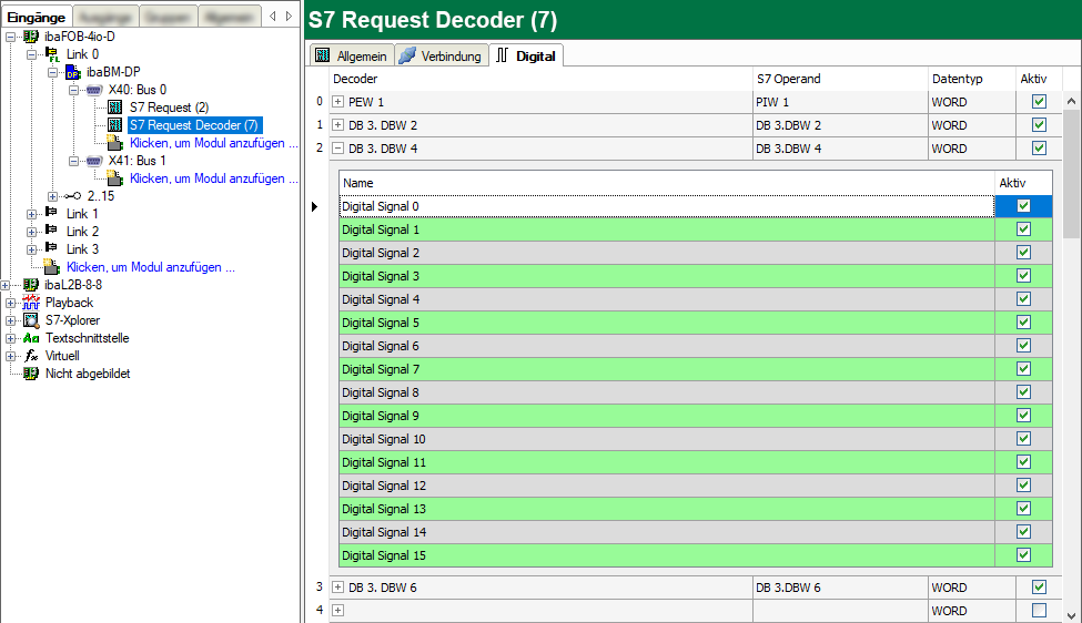 Mit dem Modul S7 Request Decoder können Sie bis zu 1024 Digitalsignale erfassen, die in Form von max. 64 Wörtern (16 Bit) gesendet werden. Dieser Modultyp eignet sich daher besonders für Anwendungen, bei denen sehr viele Digitalsignale erfasst werden müssen und die max. 1024 direkt adressierbaren Digitalwerte des ibaBM-DP nicht ausreichen.