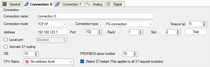 Set the DB number, the PROFIBUS slave number and the CPU name for assigning an address book only once in the Connection 0 tab.