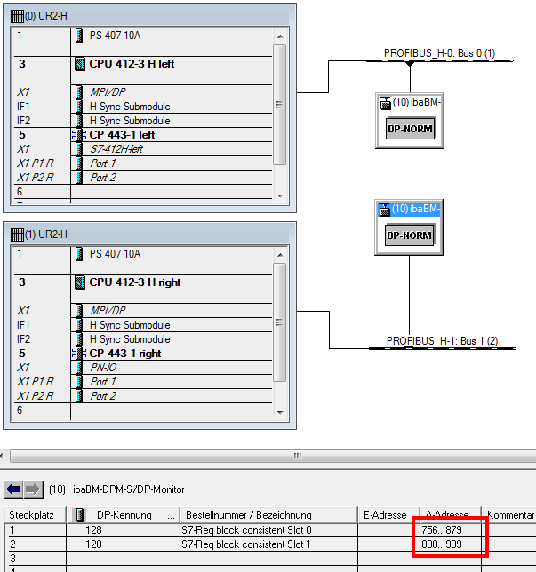 Projektieren Sie beide projektierten Slaves mit identischen Busadressen. Die I/O-Adressbereiche sind jedoch unterschiedlich. Verwenden Sie die Module "S7-Req block consistent Slot 0 / Slot 1".