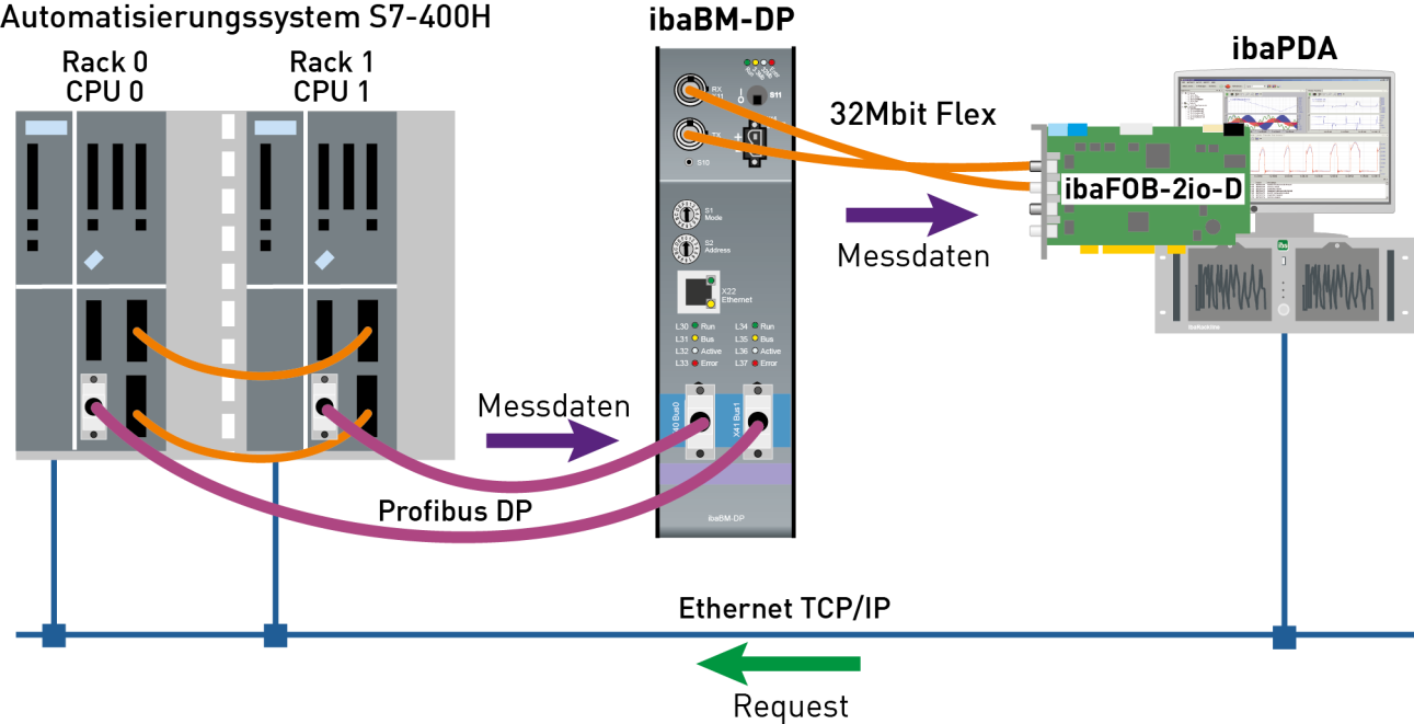 Request-S7 redundant ist geeignet, um ibaBM-DP mit Request-Funktionalität als einkanalig geschaltete Peripherie an einer hochverfügbaren SIMATIC S7-400H Steuerung zu betreiben.