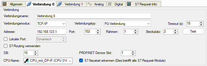 Stellen Sie die DB-Nummer, die PROFINET-Device-Slots sowie den CPU-Name für die Zuweisung eines Adressbuchs nur einmal im Register Verbindung 0 ein.