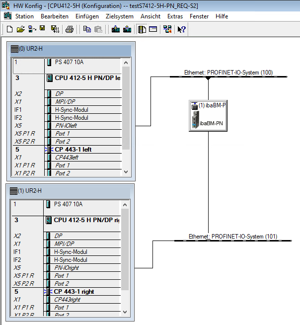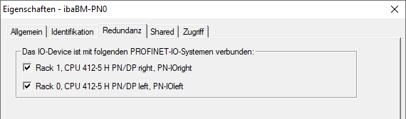 Wenn Sie ein ibaBM-PN in eine redundante Hardwarekonfiguration einfügen, wird dieser automatisch mit beiden PROFINET-IO-Systemen verbunden.