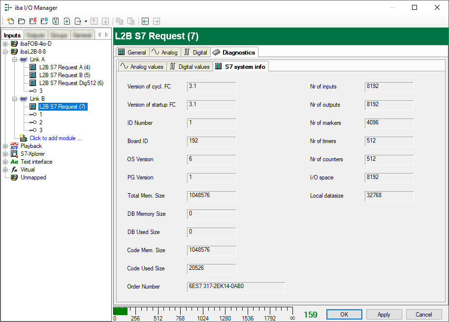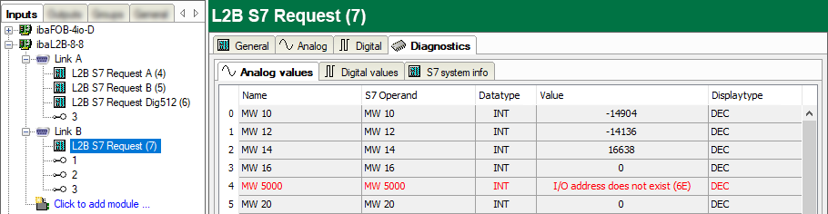 When you select an L2B-Request module node in the signal tree, in the Diagnostics tab you can see details of the individual measured values and system information of the S7-CPU in the subtab S7 system info.