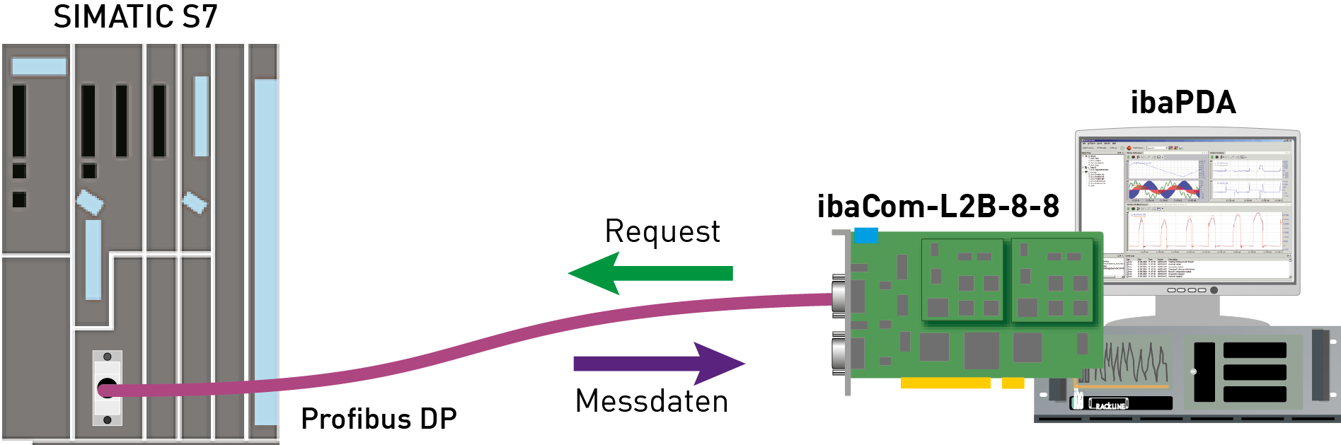 Beim L2B-Request erfolgt die Anforderung der Messwerte (Request-Handshake) über den PROFIBUS. Hierzu dient ein Teil des I/O-Bereichs des jeweiligen PROFIBUS-Slaves. Sie benötigen keine weitere TCP/IP-Verbindung vom ibaPDA-Rechner zur S7-Steuerung für die Konfiguration und Projektierung.