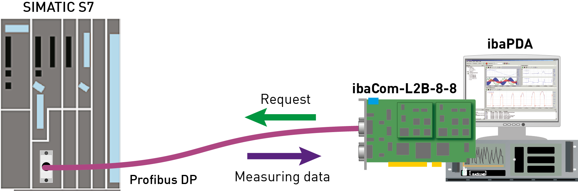 With the L2B Request, the measurement request (Request Handshake) is sent via PROFIBUS. A section of the IO range of the respective PROFIBUS slave is used for this purpose. No TCP/IP connection between the S7 controller and the ibaPDA computer is required for configuring.