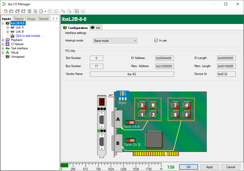 If an ibaCom-L2B card is installed in the ibaPDA computer, ibaPDA displays the interface of the ibaCom-L2B card in the interface tree of the I/O Manager.