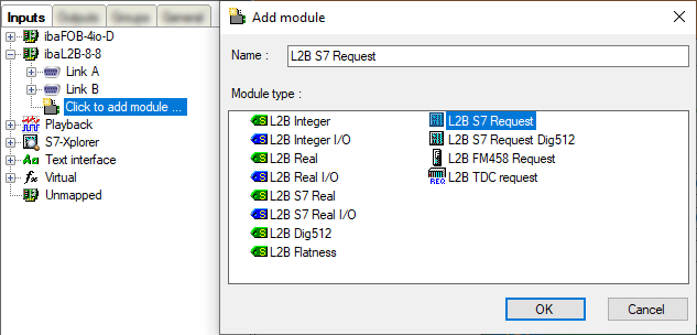 The module types L2B S7 Request and L2B S7 Request Dig512 are available.