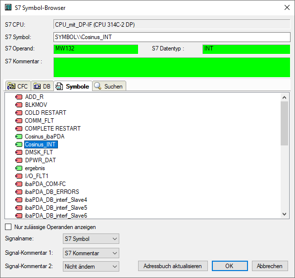 Nach Auswahl einer Variablen zeigt der Symbol-Browser Operandenadresse, Datentyp und Signalkommentar an.