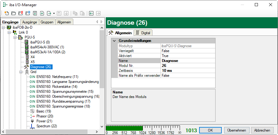 Im Modul Diagnose stehen Diagnosesignale zur Verfügung. Das Modul muss manuell hinzugefügt werden, indem Sie mit der rechten Maustaste auf das PQU-S-Modul klicken und Diagnose aus dem Kontextmenü wählen.