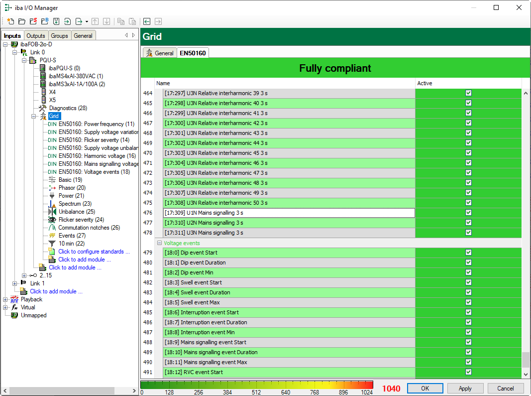 The EN50160 tab lists all signals calculated in the EN50160-compliant submodules. The message “Fully compliant” against a green background confirms compliance with the standard. If individual signals are disabled, the display changes to “Partially compliant” on a white background.