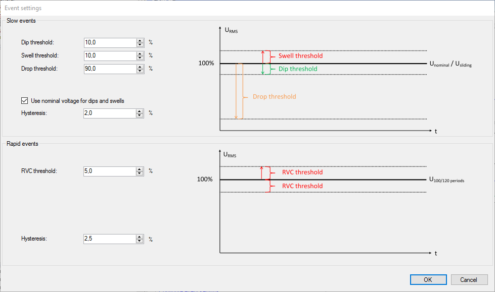 Using the check box Use nominal voltage for dips and swells you can set if the threshold values and the hysteresis of the slow events refer to the nominal voltage or to a floating reference value.