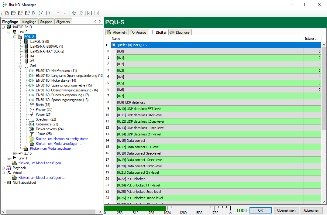 In der Liste werden die konfigurierten digitalen Signale, die digitalen Statussignale von ibaPQU-S und die aktuellen Werte angezeigt.