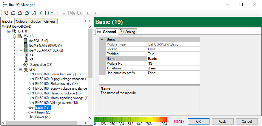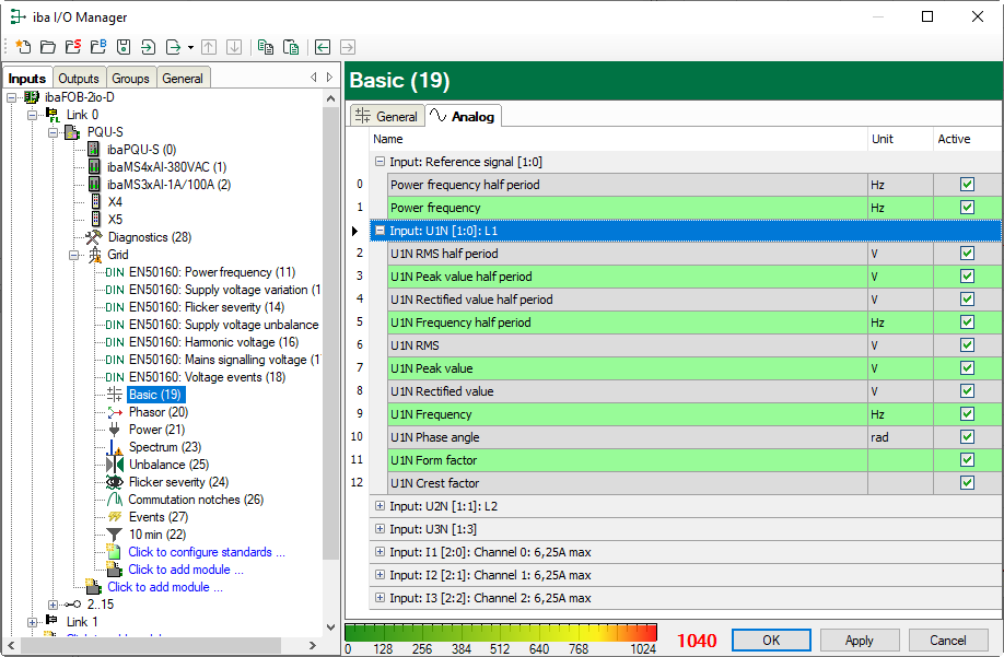 For each input: RMS value, peak value, rectified value and frequency in 200 ms and half period measurement intervals