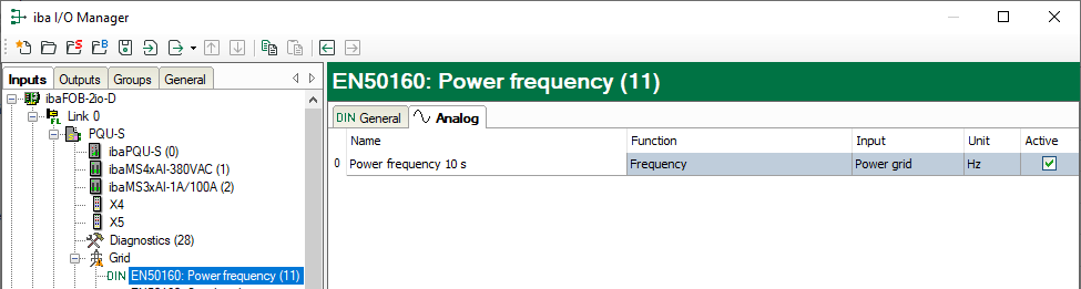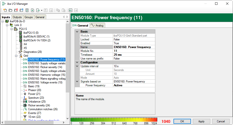 The Configuration section shows the characteristic value that is determined by this module as well as the measurement interval. Here: Power frequency acc. to EN50160, 10 s
