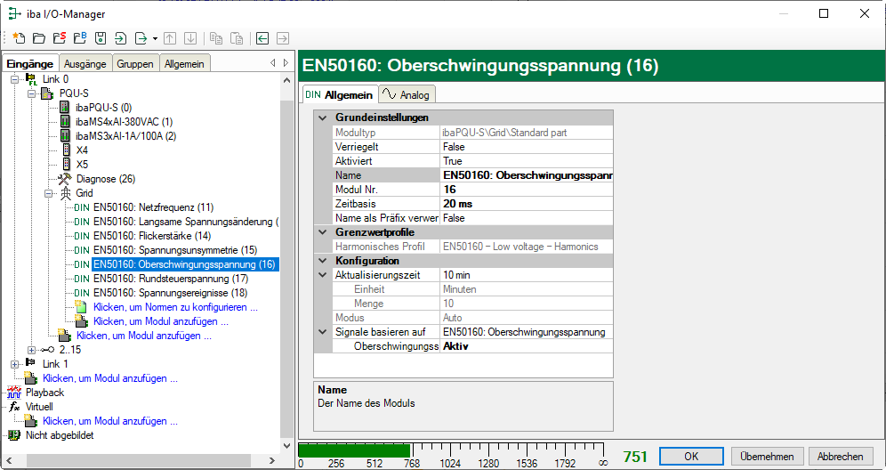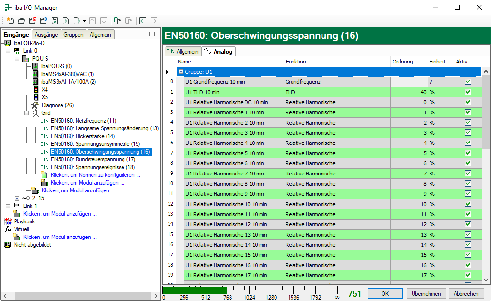 • Im Bereich Konfiguration werden die Kennwerte, die mit diesem Modul ermittelt werden und das Messintervall angezeigt. Hier: Oberschwingungsspannung nach EN50160, 10 min.