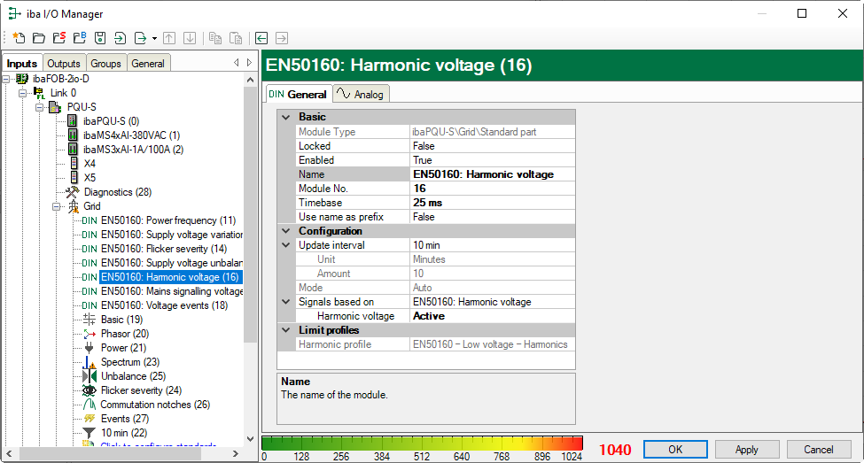 The Configuration section shows the characteristic values determined by this module as well as the measurement interval. Here: Harmonic voltage acc. to EN50160, 10 min.