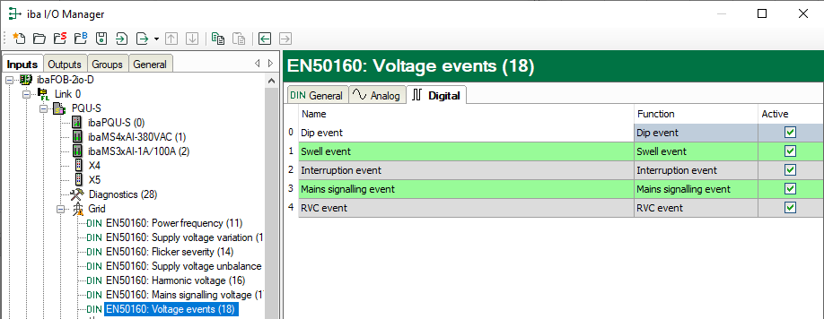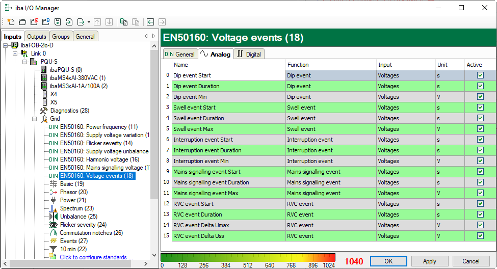 The Configuration section shows the characteristic values determined by this module as well as the measurement interval. Here: Voltage events acc. to EN50160, half period.