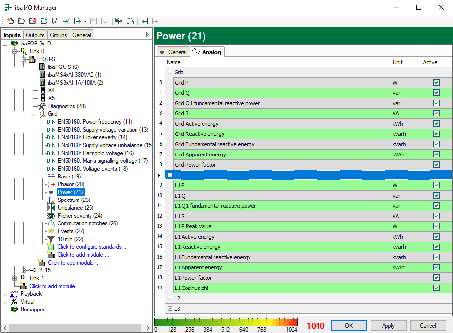 Depending on the AC/DC setting and the configured grid inputs, the Analog tab contains different characteristic values.