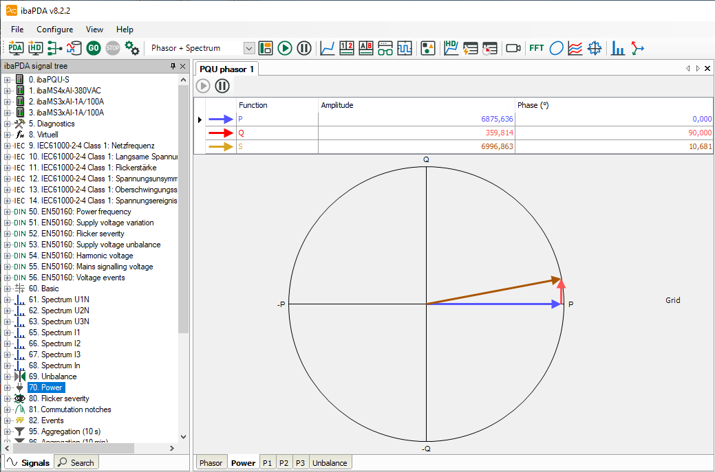 The power characteristic values can be visualized phase-wise or for the entire grid using a phasor diagram.