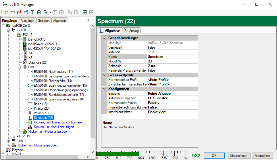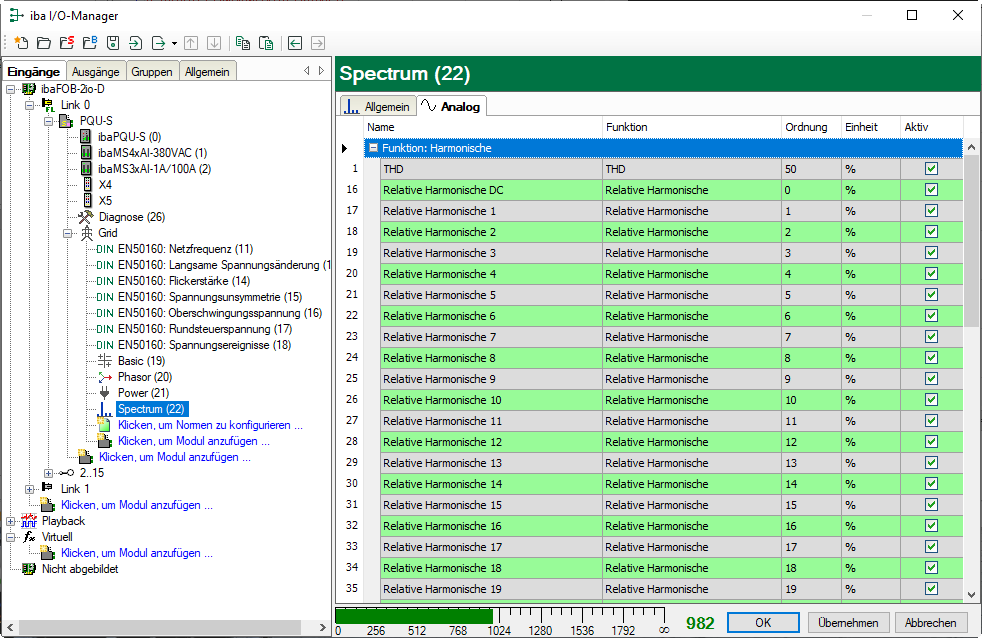 Pro ibaPQU darf die Gesamtanzahl der Submodule Oberschwingungsspannung und Spectrum neun (9) nicht überschreiten, um eine Überlastung des Systems zu vermeiden. |
