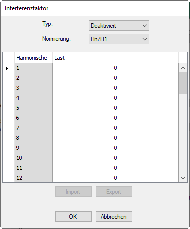 Verschiedene Berechnungsarten können für einen Interferenzfaktor ausgewählt werden.