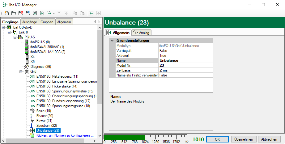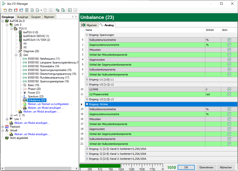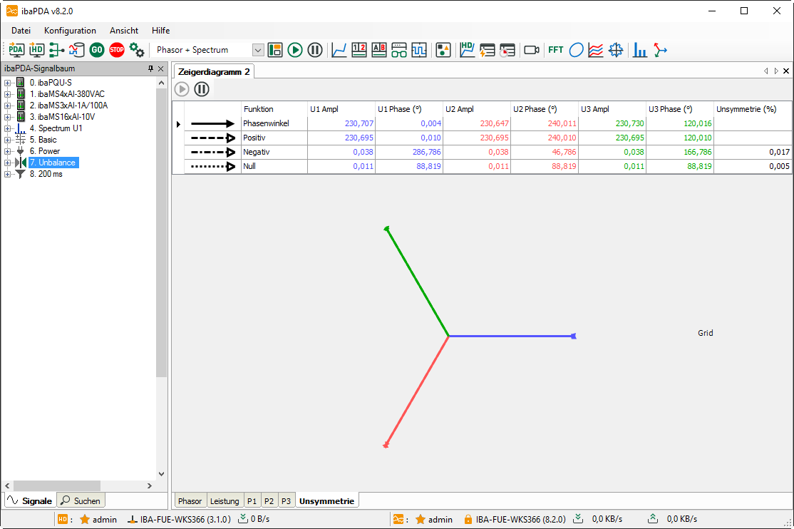 Ziehen Sie aus dem Signalbaum links das Unbalance-Modul mit gedrückter Maustaste in die Anzeige. Schalten Sie die Ansicht auf Unsymmetrie.