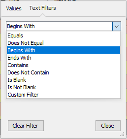 The drop-down menu provides a series of operators that can be used to filter the text in the relevant column. Select the required operator and enter the text by which you want to filter in the field below. You can enter whole words of sequences of letters.