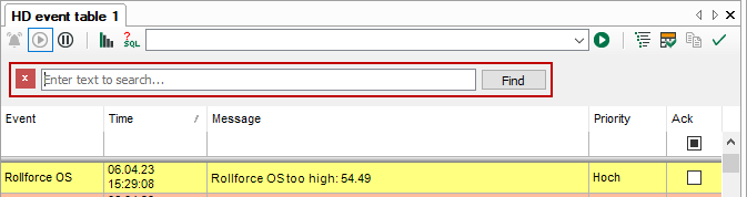 You can use the keyboard shortcut <Ctrl> + <F> to open a search function for the event list. Enter the relevant search expression and click on <Find>. The search applies to the Event column.