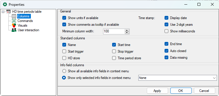 In the list, select the info fields that are to be available as additional columns in the HD time period table. You can show and hide these via the context menu.