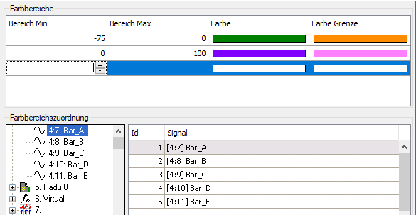 Jedem Balken muss ein Signal zugeordnet werden. Der Signalwert wird genutzt, um die Farben des Balkens entsprechend der Bereichseinstellungen zu bestimmen. Die Id-Spalte bezieht sich auf die vorhandenen Balken. Prinzipiell können dieselben Signale, die für die Balkenwerte verwendet wurden, erneut für die Farbbereiche verwendet werden. Ziehen Sie das jeweilige Signal in die gewünschte Zeile der Signaltabelle oder markieren Sie die Zeile des gewünschten Balkens und doppelklicken auf das passende Signal im Baum.