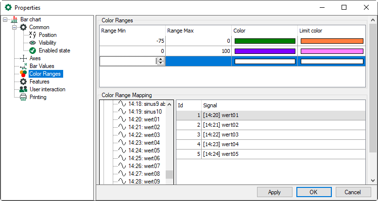 A signal must be assigned to each bar. The signal value is used to determine the bar’s colors with reference to the range settings. The Id column refers to the existing bars. Basically, the same signals as used for the bar values can be used again for the color ranges. Drag the signal to the desired line of the signal table or select the line of the desired bar and double-click on the suitable signal in the tree.