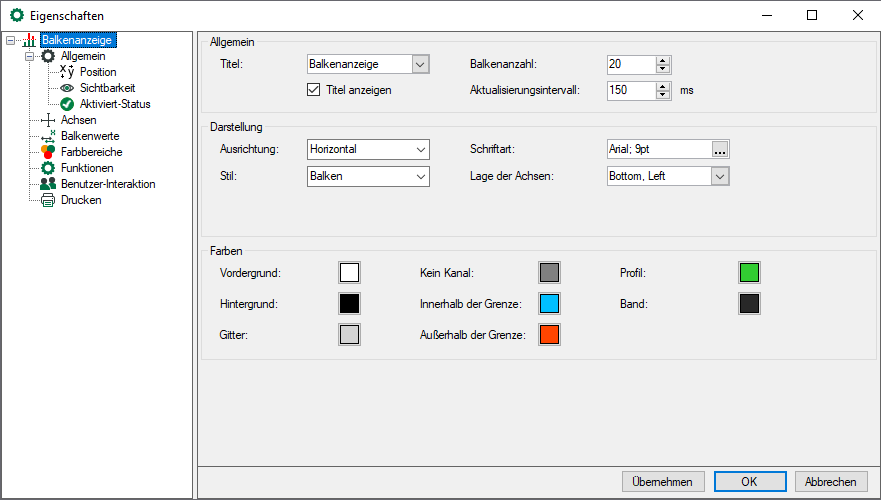 Die Farben, die Ausrichtung, der Stil (Balken, Kurven oder Punkte), die Anzahl der Balken, der Titel sowie die Schriftgröße der Anzeige können eingestellt werden. Die Aktualisierungszeit bestimmt, wie oft die Anzeige aktualisiert wird.
