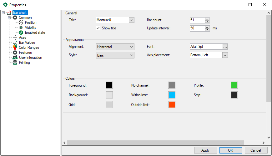 The colors, orientation, style (bars, lines or dots), the number of bars, the title as well as the type size of the display can be configured. The update interval determines how often the display will be updated.