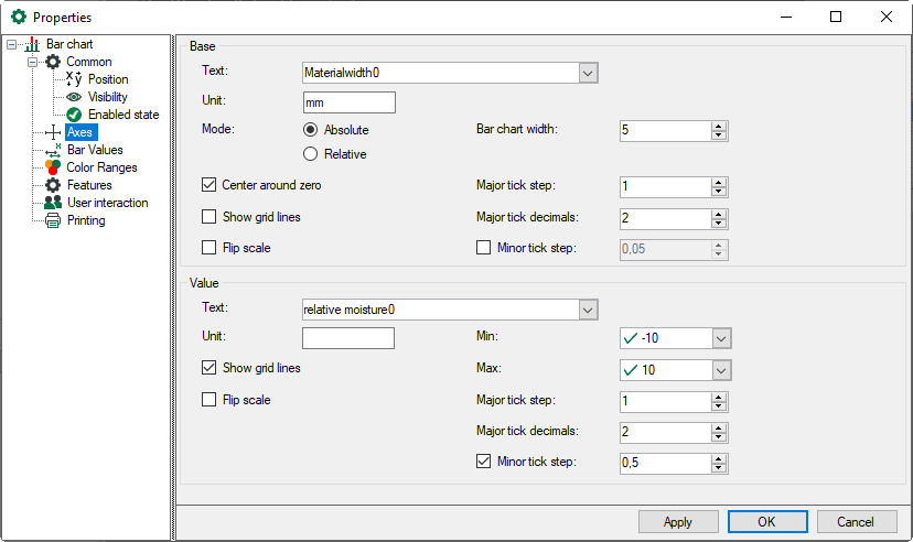 Absolute This mode was especially developed for technological cross profile displays in the steel industry, such as flatness profiles, strip tension profiles or temperature profiles. You can set up the rolling mill width (= width of bar graph) and values for major and minor tick marks on the axis given in the unit specified in the corresponding entry field (mm, cm, etc.). The number of bars as specified in the Bar chart dialog is distributed over the base axis. The width of the bars itself can be adjusted in the Bar Values dialog in the properties tree.