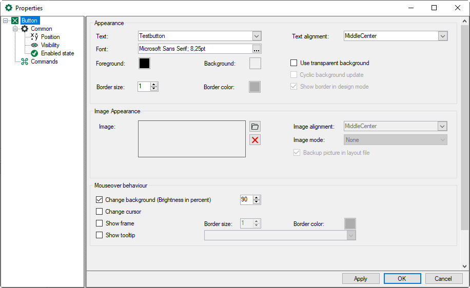 Enter the text which has to be displayed on the button, set the alignment and choose the font. You can select colors for the foreground, background and border and define a border size.