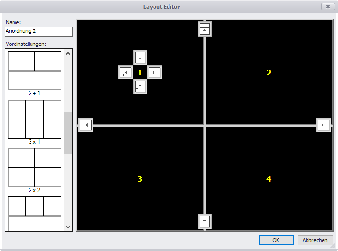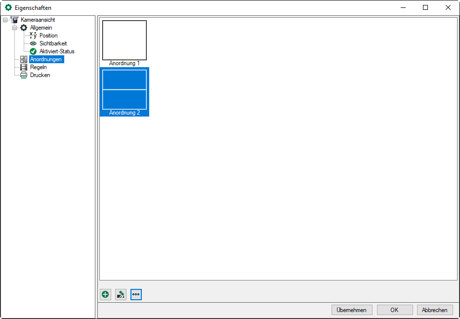 Im Zweig „Anordnungen" kann der Anwender die Anordnungen der Kamerafenster, die für