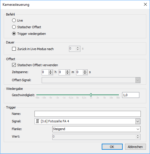 Versetzt die Kamera in den Wiedergabemodus mit einer eingestellten Wiedergabegeschwindigkeit und springt in die Vergangenheit. Sie können einstellen, ob der Sprung in die Vergangenheit um eine feste Zeitspanne erfolgt (Statischen Offset verwenden) oder gesteuert durch ein Offset-Signal.