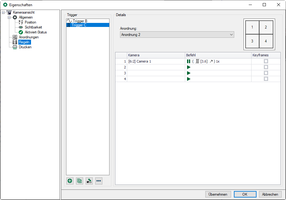Lassen Sie den Trigger ausgewählt und wählen Sie nun das zu aktivierende Layout in der Layout-Auswahlliste aus, die alle definierten Layouts enthält. Auf der rechten Seite wird das Symbol des gewählten Layouts angezeigt, und die Kameraliste wird an die Anzahl der Kameras im Layout angepasst. Für jedes Kamerafenster müssen ein Kamerasignal und ein Kamerabefehl konfiguriert werden: