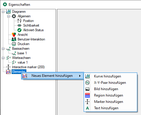Mithilfe des Kontextmenüs legen Sie die benötigten Achsen und Elemente an, die Sie verwenden möchten. Die Beschreibung der Konfiguration der einzelnen Elemente finden Sie ab Kapitel Elemente.