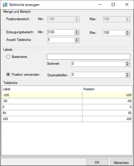 Im Bereich Menge und Bereich geben Sie die Anzahl der gewünschten Teilstriche ein. Der Positionsbereich dient der Anzeige des maximal möglichen Bereichs aus dem vorhergehenden Dialog. Die Grenzen des Erzeugungsbereichs Min. und Max. entsprechen dem Bereich, den der Benutzer anpassen will bzw. ändern oder hinzufügen.