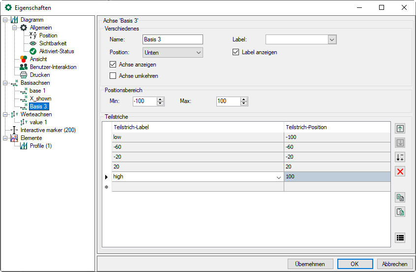 Im Bereich Labels können Sie eine Bezeichnung der Teilstriche vorgeben. Standardmäßig wird die Position als Bezeichnung verwendet. Mit der Option Basisname können Sie einen Namen vorgeben, der in aufsteigender Reihenfolge nummeriert wird. Die Anfangsnummer definieren Sie bei Startwert. Im Beispiel oben ist der Basisname „pos", beginnend mit dem Wert „0". Es ist auch möglich, individuelle Bezeichnungen einzugeben. Außerdem können Sie festlegen, wie viele Dezimalstellen angezeigt werden (maximal 8).