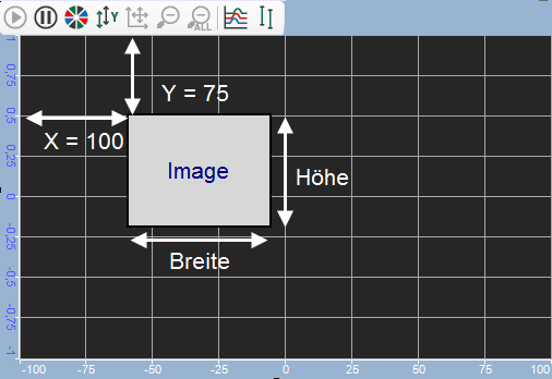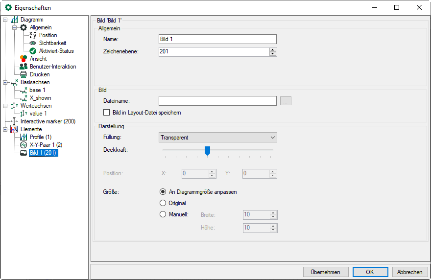 Das Bild kann gestreckt werden, um es in die Größe des Diagramms einzupassen oder es kann in der Originalgröße abgebildet werden. Ist das Original größer als das Diagramm, wird nur ein Teil des Bildes angezeigt. Die Größe kann auch manuell mit einer gewünschten Breite und Höhe (in Pixel) angegeben werden sowie einem X/Y-Versatz (Position), der sich auf die linke obere Ecke bezieht.