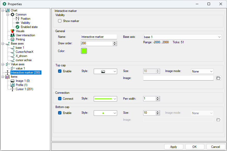 The interactive marker consists of a top and a bottom cap (symbol) and a connecting line. For each element, you can select a style as well as define its size and visibility. Apart from the display styles triangle and square for the top and bottom cap, you can also select an image. You can select a image mode to display the image:
