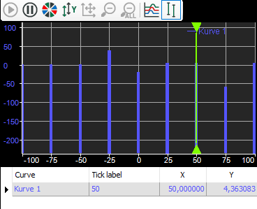 If the interactive marker is visible (green line in the picture above), a table will be displayed below the diagram that shows the x and y values of all curves that are defined at the marked position. The interactive marker can be moved by a mouse click. It will then jump to the tick mark that is nearest to the mouse position.