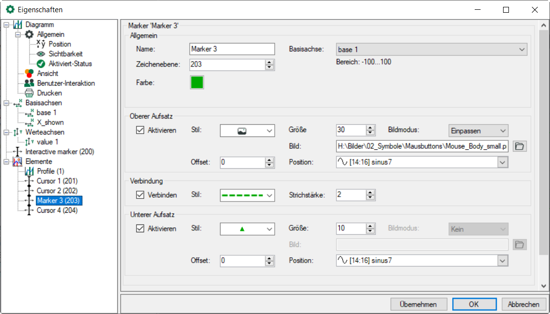 Die Farbe des Markers, die Zeichenebene und die zugehörige Basisachse werden unter Allgemein festgelegt.