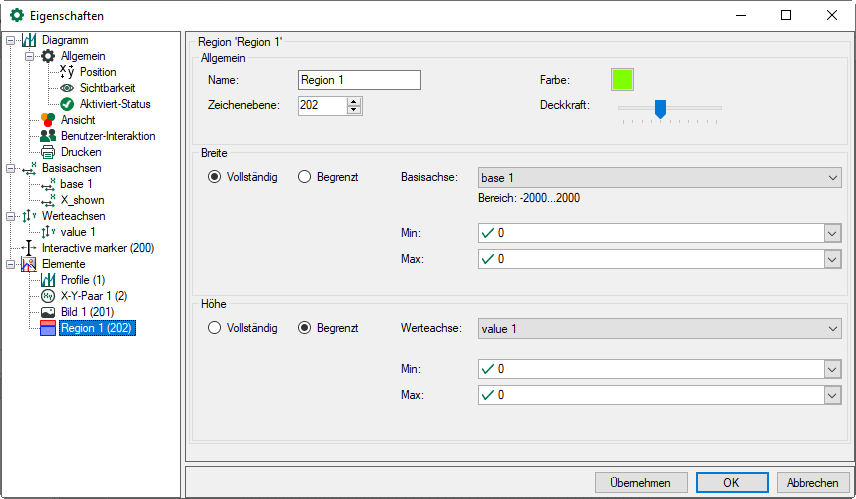 Die Lage der Region wird unter Breite und Höhe definiert. Dabei können sich die Breite und die Höhe der Region über das gesamte Diagramm erstrecken (Option Vollständig) oder nur einen Bereich abdecken.