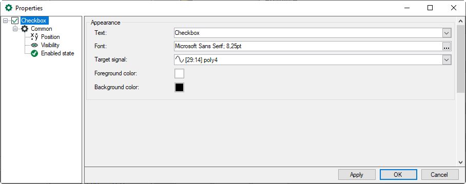 Enter here the text to be shown in the checkbox, and select the font type. For “Target signal”, select the ibaQPanel target signal that you want to write to.